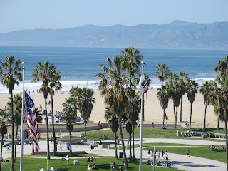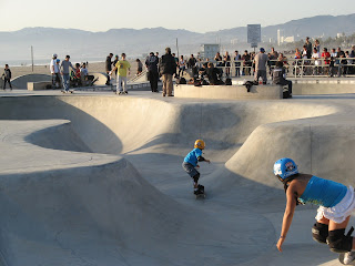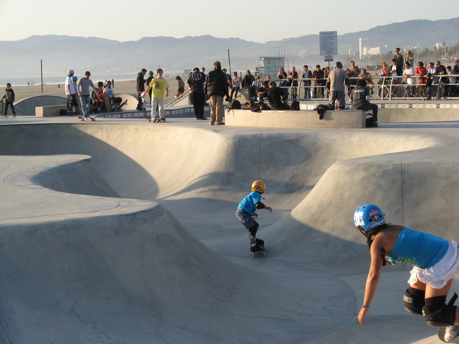 From here, you can take off your shoes and shuffle on the sand to the water. Most days the beach is almost empty except for a few sunbathers, surfers, or meditators gazing at the sailboats gliding off shore or, at the right time of year, dolphins playing in the breaking waves. Look south and you can usually see the outline of Santa Catalina Island in the distance; look north and you can get a better look at the background that framed the soaring skateboarders — a beach curving around a vast bay all of the way to Malibu and beyond. Behind that, the Santa Monica Mountains taper down to the ocean. When visitors tell me that they think that Los Angeles is ugly, this is where I bring them to change their mind. I have never failed to do so.