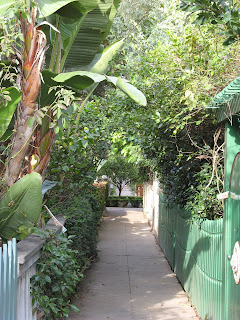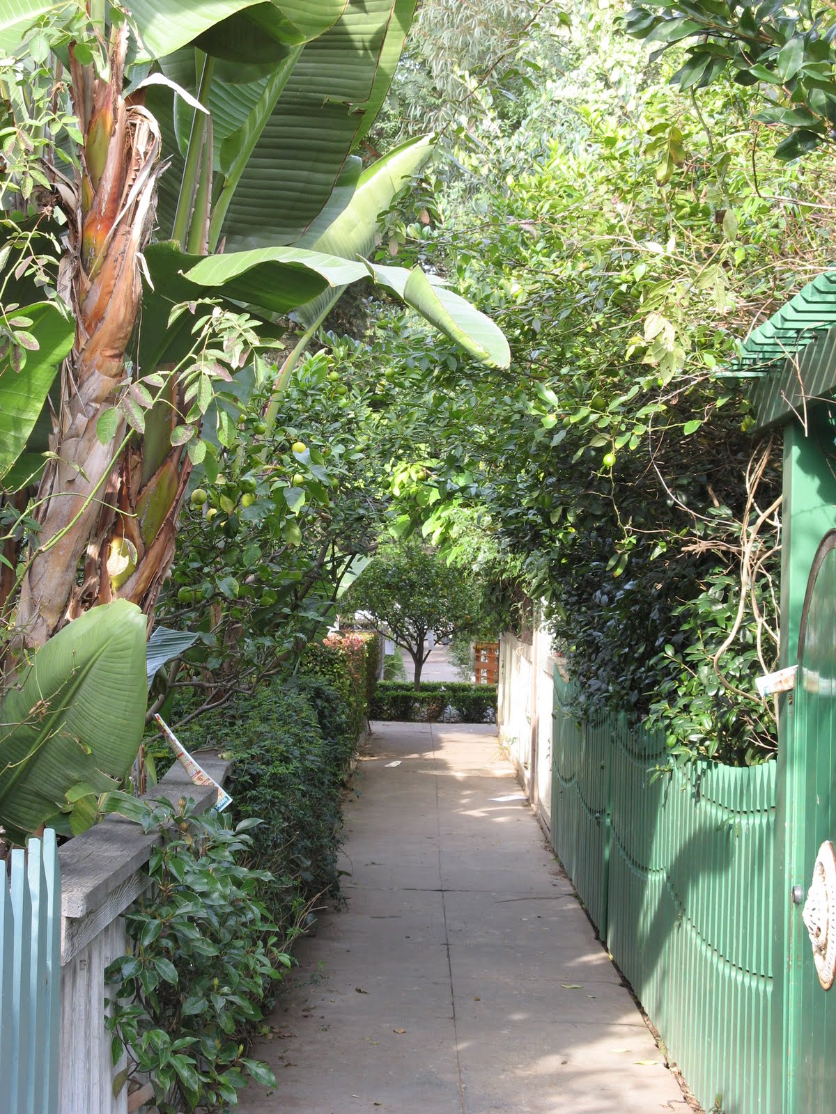 This is Crescent Place, the portal to the inland walk streets. Tall trees and bamboo and overgrown ivy and bushes line the path on both sides and arch overhead. Turning down this path is like entering a wormhole into another universe, or falling into a rabbit hole like Alice on her way to wonderland. Follow Crescent until it ends one block later at Shell Avenue. Shell is marked by a landscaped traffic circle, but with little if any traffic, it is more like an urban park than a traffic circle. Turn right and follow Shell for a block or so until you see the beginning of another walk street, Marco Place, on your left.
